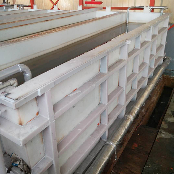 PP水箱液體的加工采用采用塑料王毛細(xì)管換熱器,加熱熱源大於85攝(shè)氏度的熱(rè)水(熱水則由蒸汽(qì)加溫)。塑料王毛細管換熱器豎直放置於酸洗槽內壁(bì)側,將熱(rè)水打入換(huàn)熱器(qì)的(de)毛細管內,在管壁傳導的作用下,迅速平穩地加熱酸洗液,冷卻後的冷凝(níng)水從毛細管內導出酸洗槽體。