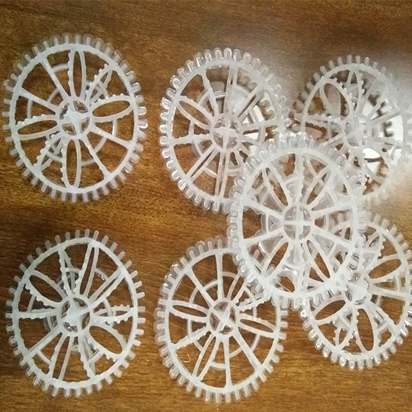 其結構是(shì)將塑料圓片壓扣改成雙圈(quān)大塑料環,將醛化纖維或滌綸絲壓在環的環(huán)圈上,使纖維束均勻分布;內圈是(shì)雪花狀塑料枝條,既能掛膜,又能有效切割氣泡,提高氧的轉移速(sù)率和利用率。使水氣生物膜得到(dào)充(chōng)分交換(huàn),使水中的有機物得(dé)到高(gāo)效處理。